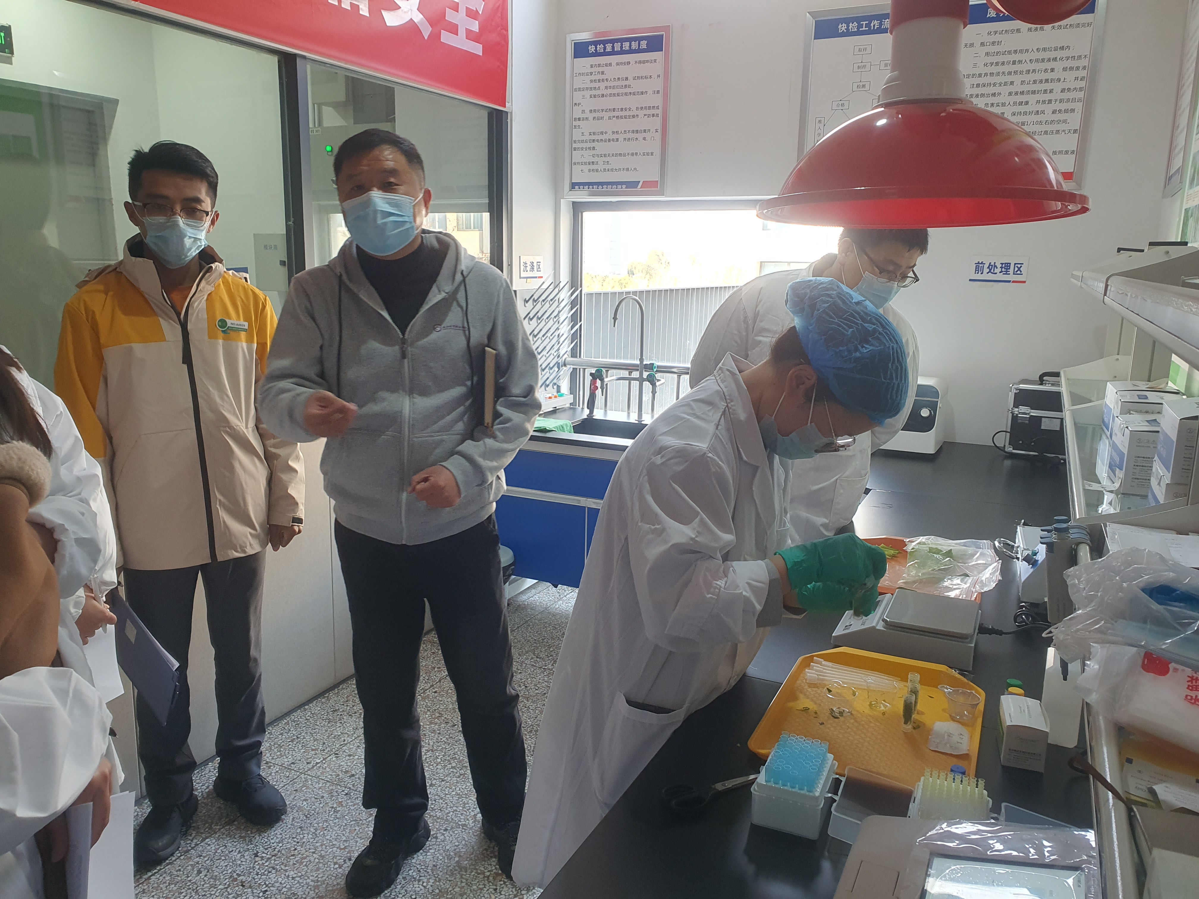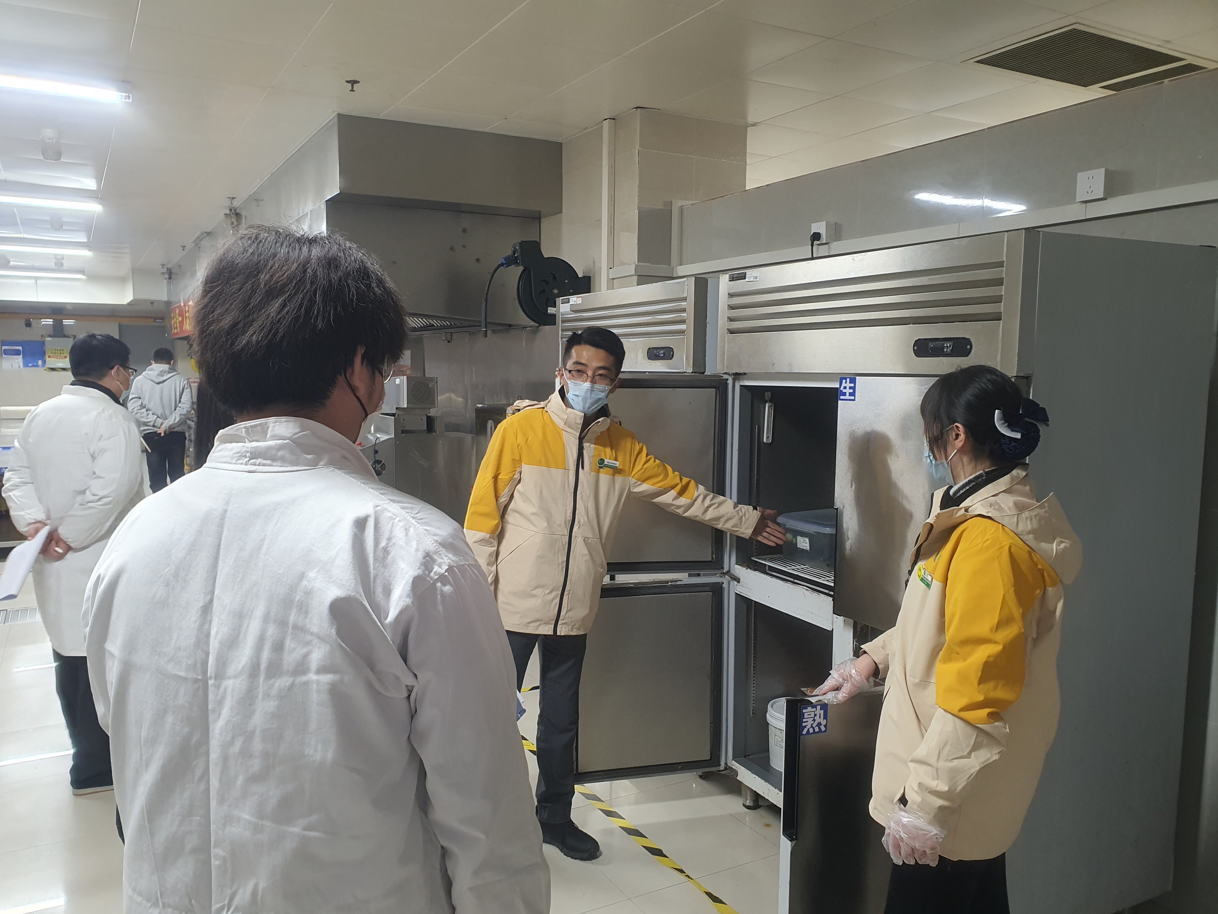活动开始,同学们统一佩戴好防尘帽和口罩,在食堂工作人员的指引下走进后厨,依次参观了厨房的各个区域,包括食材存储区、加工区、烹饪区、清洗消毒区和食品原料快检室等。在现场参观环节,金永刚老师向同学们介绍了学校在不断升级食堂标准化建设提高食堂食品安全管理水平方面的工作情况和在确保师生饮食营养健康方面的具体举措。接下来,食堂经理详细介绍了食堂的整体布局、运营理念以及食品原料验收和质量监测、仓库物资规范化存储管理、食品原料规范化加工、菜品烹饪和留样等加工过程。